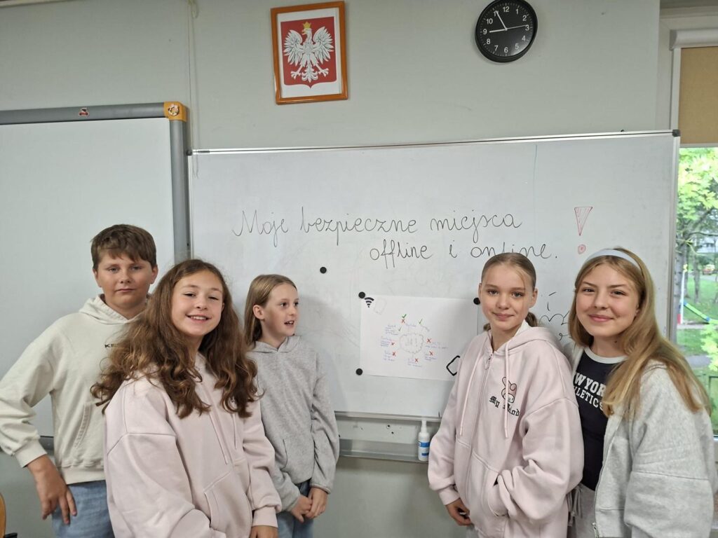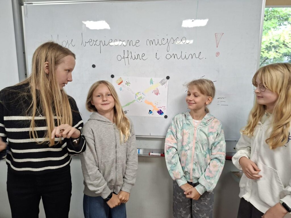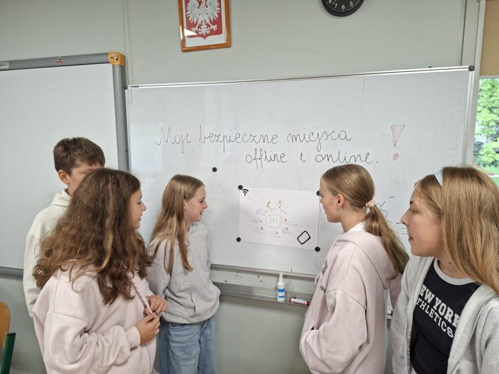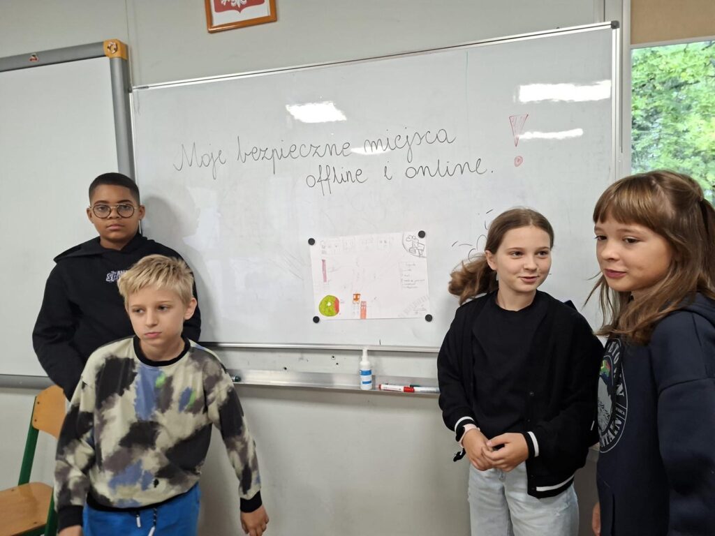 Uczniowie klasy 5A rozpoczęli cykl lekcji wychowawczych poświęconych bezpieczeństwu w świecie realnym i wirtualnym. Dzisiejsze zajęcia polegały na tworzeniu map bezpiecznych miejsc w obu przestrzeniach oraz na dyskusji o możliwych zagrożeniach. W trakcie pracy uczniowie uczyli się także formułowania argumentów „za” i „przeciw”. Przed nimi kolejne wyzwania.